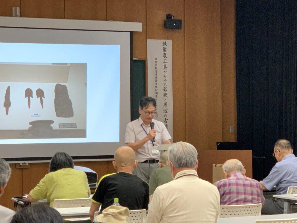 古墳時代の鉄製農工漁具は、前期・中期と普及し、後期になると減少します。そのような傾向が全国的に認められるなか、若狭では古墳時代後期においても鉄製農工具のセットが副葬されています。講座では、古墳時代中期から後期までの鉄製農工漁具の形態や組成の変遷と、若狭の古墳から出土した鉄製農工漁具をもとに、渡来文化の受容と展開を背景とした若狭と丹後、近畿中央部、丹波との関連性が指摘されました。