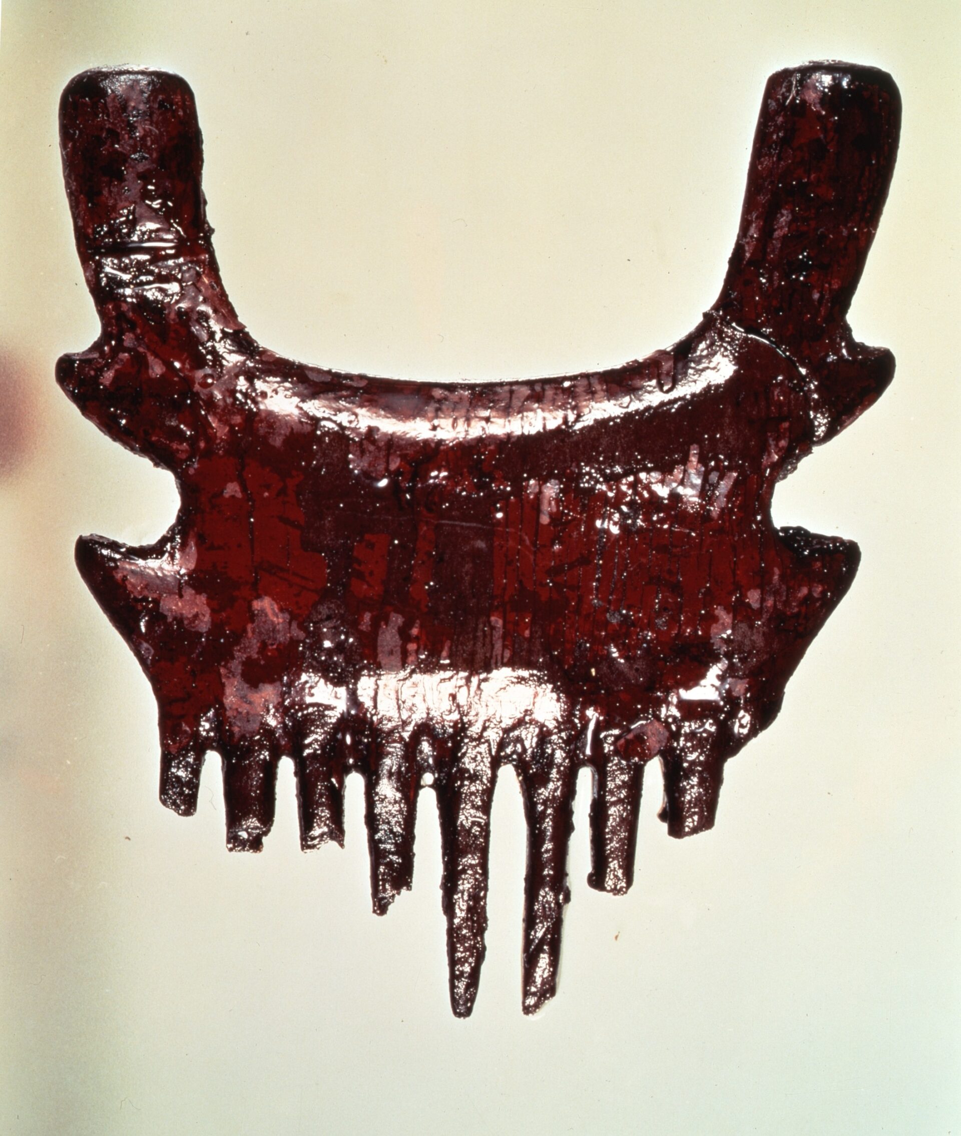 | 内容 | このたび、およそ4年ぶりに、縄文漆のシンボルともいえる鳥浜貝塚の赤色漆塗り櫛の実物を期間限定で公開します。 福井県若狭町に所在する縄文時代の鳥浜貝塚は、貝塚をともなう低湿地遺跡です。そのため、遺物の保存状態が非常に良く、1970・80年代の発掘調査では、大量の有機質の遺物が出土しました。なかでも、およそ6000年前の漆器群の出土は、縄文時代に確立された漆工技術の高さを証明する重要な発見となりました。特に、一枚板から削り出された刻歯式の赤色漆塗りの竪櫛は、鳥浜貝塚の漆器を代表する逸品です。 |